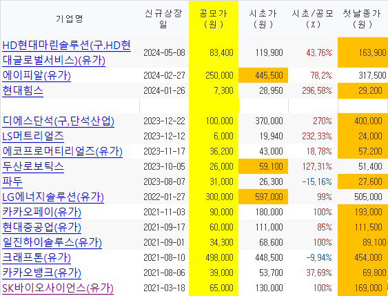 | 기업명 | 상장일 | 공모가 | 시초가 | 시초/공모 | 첫날종가 | 첫날고가 |