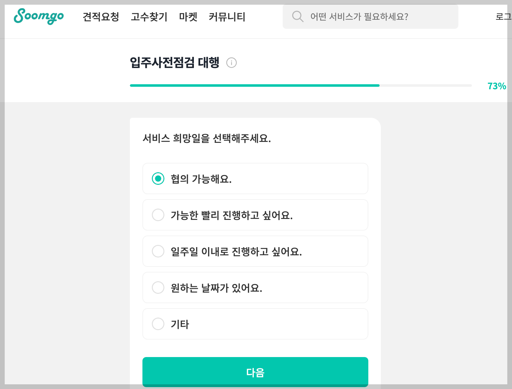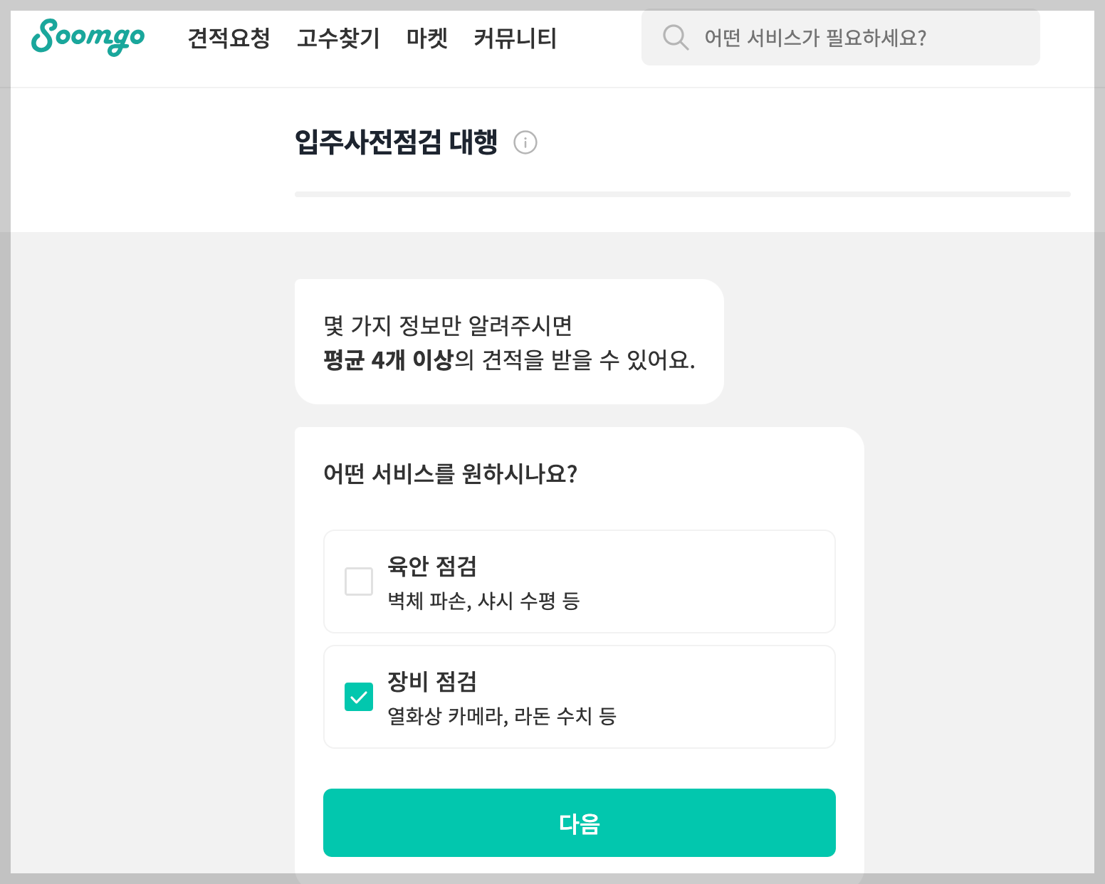 숨고에서는 여러 업체들의 견적을 무료로 받아 가장 저렴한 곳에서 서비스를 받을 수 있다는 점이 장점입니다. 지역/장비 혹은 육안점검/평수 등을 선택하고 고수와 직접 상담할 수 있습니다.